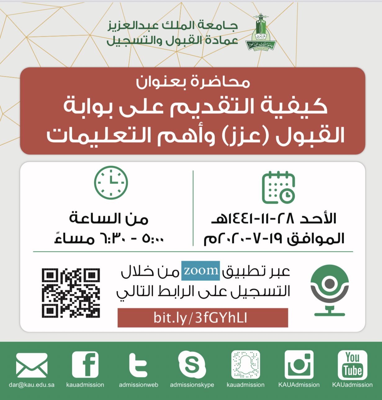 عمادة القبول والتسجيل Kau On Twitter لقاء مفتوح على Zoom كيفية التقديم على بوابة القبول عزز وأهم التعليمات الأحد ٢٨ ١١ ١٤٤١هـ الموافق ١٩ ٧ ٢٠٢٠م من الساعة ٥ ٦ ٣٠ مساء عبر تطبيق Zoom من