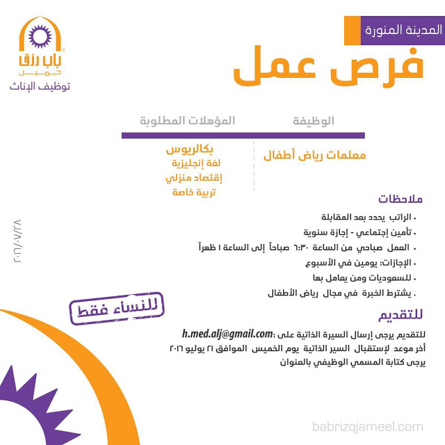 تقد م إلى أحدث الوظائف الشاغرة في المدينه المنوره واعثر على وظيفة بأسرع وقت. وظائف شاغرة في المدينة المنورة وفرص عمل لمختلف التخصصات تصفح مئات الوظائف الشاغرة وفرص العمل كل يوم في مدينة المدينة المنورة السعودية لمختلف المجالات والتخصصات. مطلوب مشرف انتاج لمصنع ألومينيوم مطابخ. سبتمبر 15 2019 فرص عمل.