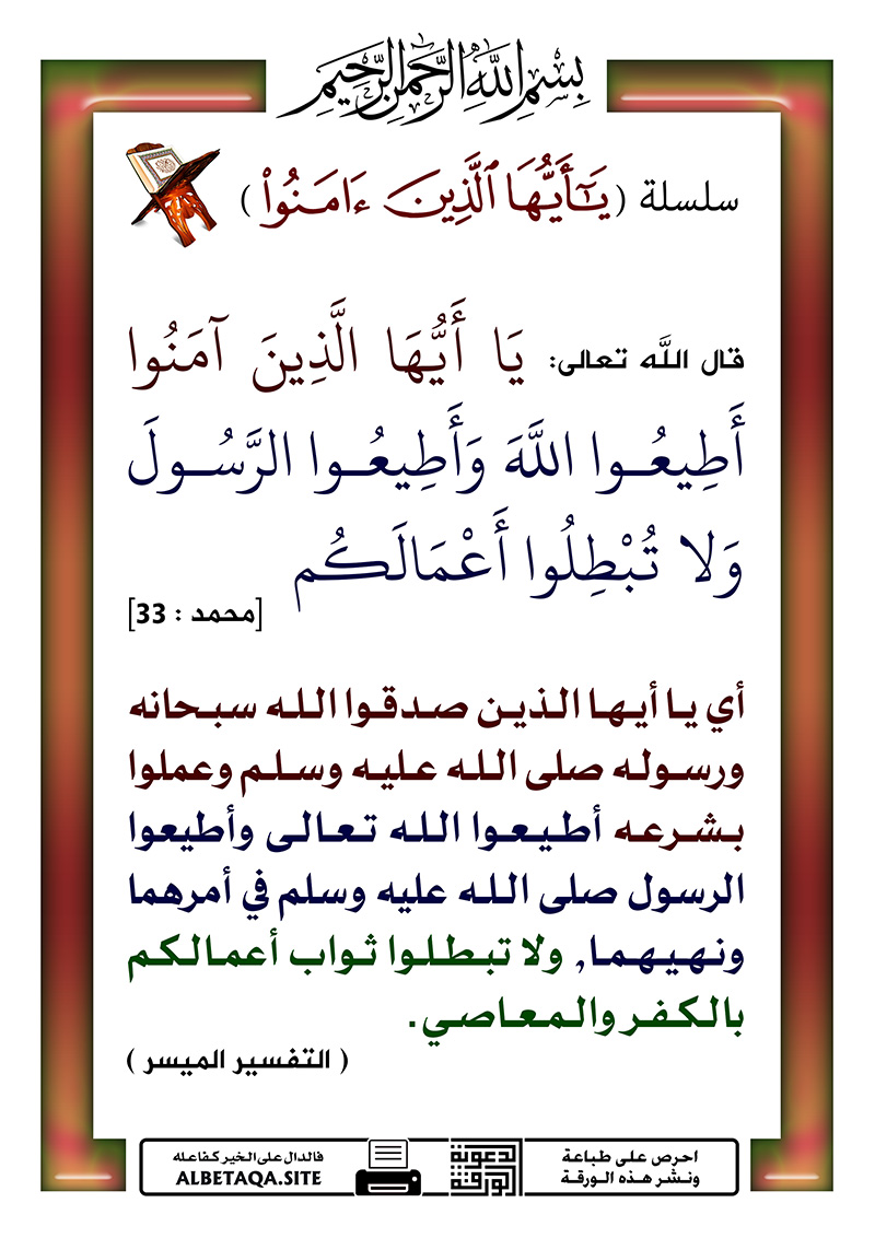 أطيعوا الله ورسوله ولا تولوا عنه وأنتم تسمعون موقع البطاقة الدعوي