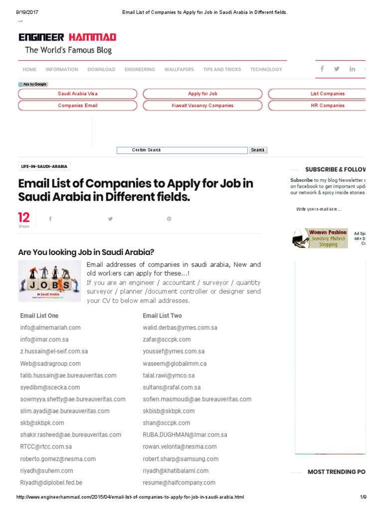Email List Of Companies To Apply For Job In Saudi Arabia In Different Fields Email Information Age