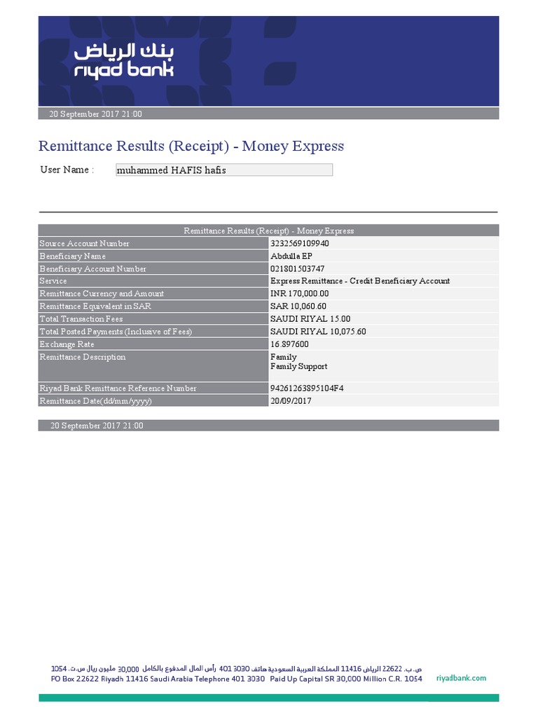 Remittance Results Receipt Money Express User Name Muhammed Hafis Hafis